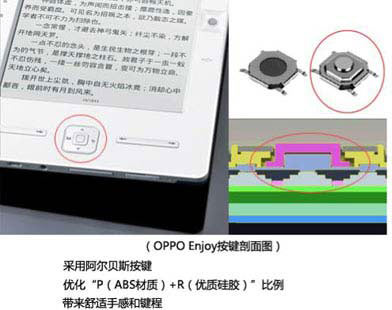 翻頁(yè)鍵要考慮拇指指腹大小以及表面弧度。OPPOEnjoy的翻頁(yè)鍵是一個(gè)類似波浪的設(shè)計(jì),保證指腹是在一個(gè)曲率半徑較大的弧線上進(jìn)行操作,非常接近自然狀態(tài)。這樣的設(shè)計(jì)的好處,可以在不增加鍵帽的視覺(jué)高度基礎(chǔ)上,增加鍵程,緩解按鍵過(guò)多的疲憊感,關(guān)于鍵程增加帶來(lái)的益處在手感篇詳談。