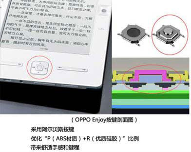 目前按鍵基本采用的都是ABS材質(zhì)類似電腦鍵盤,有過(guò)去網(wǎng)吧經(jīng)驗(yàn)的人就知道,通過(guò)看鍵盤上字跡的磨損程度和磨損的鍵位就知道近是流行CS還是勁舞團(tuán),字跡的耐磨度是一個(gè)不小的考驗(yàn)。目前一般是采用激光鐳雕或者絲印,但是電子書產(chǎn)品一般是白色的面殼,如果采用激光鐳雕會(huì)留下比較明顯的痕跡,但如果直接把絲印暴露在外面,長(zhǎng)期摩擦字跡就會(huì)消失,為了解決這個(gè)矛盾,Enjoy創(chuàng)新采用一種夾層工藝,ABS表面首先噴涂底層(主要是著色),然后絲印,后在絲印上再采用噴油工藝,這樣就保證了絲印的耐磨度同時(shí)也隔絕了手上汗?jié)n對(duì)絲印的侵蝕。