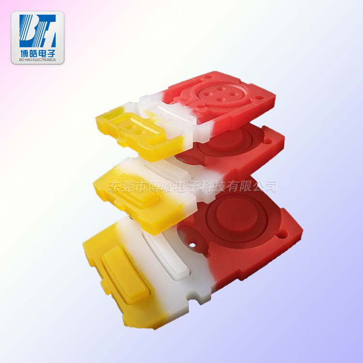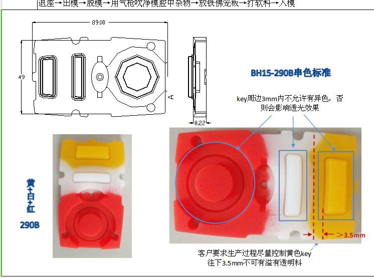 其實,在做這款硅膠按鍵之前,是有一個小故事的,澳洲這家客戶在中國找了幾家硅膠制品廠,但品質(zhì)老是做不到他們的要求,硅膠不同顏色的區(qū)域要求離按鈕3.5mm內(nèi)不能有其他顏色硅膠。