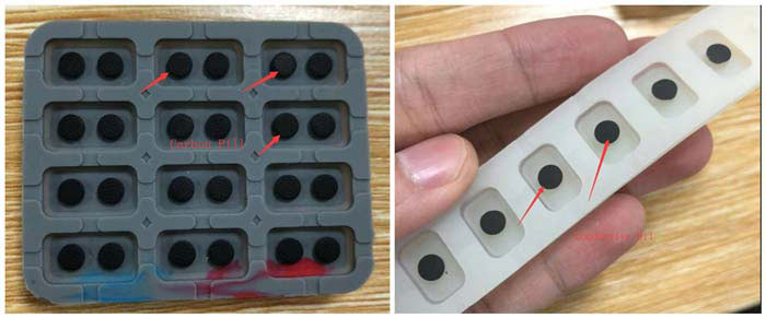 對(duì)于直接和PCB板接觸導(dǎo)電的按鍵來(lái)說(shuō),觸電位置會(huì)用碳粒或是涂導(dǎo)電油墨來(lái)實(shí)現(xiàn)。