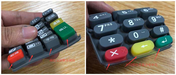 很多硅膠按鍵上面不同的按鈕需要對(duì)應(yīng)不同的硅膠顏色。 要實(shí)現(xiàn)這樣的效果有兩種方法,第一種就是通過(guò)不同顏色的料擺放在不同的位置一次成型出來(lái), 另一種就是先把色K(也就是不同顏色的單個(gè)按鈕)單獨(dú)成型(把硅膠生料通過(guò)模具和加硫使其固化成型),再通過(guò)二次成型實(shí)現(xiàn)同一按鍵上有不同顏色的按鈕。