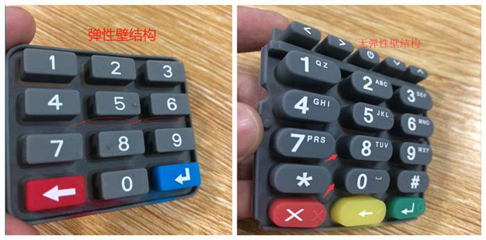 大多數(shù)硅膠按鍵都是選擇用碳?;蚴菍?dǎo)電油墨來(lái)實(shí)現(xiàn)導(dǎo)電功能,而直接通過(guò)按鍵來(lái)導(dǎo)電則要求按鍵具有按下去彈回來(lái)的彈性壁結(jié)構(gòu)。(鍋?zhàn)衅洼p觸開(kāi)關(guān)他們自帶回彈功能,所以對(duì)應(yīng)的硅膠按鍵一般不需要再設(shè)計(jì)彈性壁結(jié)構(gòu))
