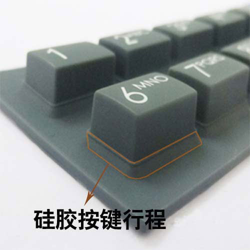 行程是指硅膠按鍵的導(dǎo)電面到PCB之間的距離,這個(gè)要靠硅膠按鍵與塑膠外殼的設(shè)計(jì)來配合,一般我們做遙控器按鍵的行程通常都做到1.1±0.1mm,這個(gè)行程能夠滿足大眾的手感要求,按鍵在按下的過程中有明顯的段落感,手感舒適,這種行程的按鍵高度一般要高出機(jī)殼1.7mm左右,即按鍵按下后表面還高出機(jī)殼0.5mm左右,這樣就能避免硅膠按鍵卡鍵或者彈不起來的問題。