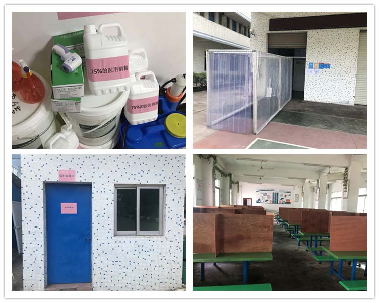 其次我們完善了廠區(qū)防疫設(shè)施設(shè)備,加強了廠區(qū)衛(wèi)生安全。公司配備了臨時隔離室和隔離留觀室,在進入生產(chǎn)硅膠制品的車間入口設(shè)立了安全通道,紅外測溫被配備了口罩手套。飯?zhí)眠M行了改造,每個位置采用了隔板確保兩人相隔一米。廠區(qū)包括員工宿舍都噴灑了84消毒液進行消毒處理,飯?zhí)弥匦掠盟疀_洗干凈,垃圾桶則暫時遷移到廠門外。