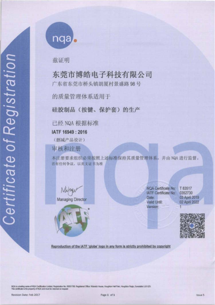 2018年IATF 16949的認(rèn)證,讓博皓硅膠制品廠內(nèi)部的各個(gè)環(huán)節(jié)全部按體系標(biāo)準(zhǔn)進(jìn)行作業(yè),本來(lái)就把品質(zhì)和客戶滿意度放在第一位的我們,可以更自信的和客戶說(shuō)我們做出來(lái)的產(chǎn)品您可以放心。