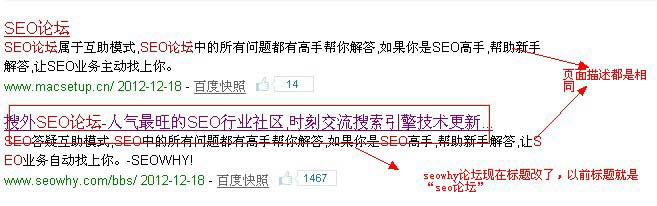 案例一、首先是我們搜索“seo論壇”,排名第一的既然是一個(gè)無(wú)與倫比的“仿站”,而且仿造的是很沒(méi)有水平,logo,頁(yè)面描述,關(guān)鍵詞,標(biāo)題,首頁(yè)的大致布局,板塊的名稱全tmd的模仿seowhy論壇,如圖: