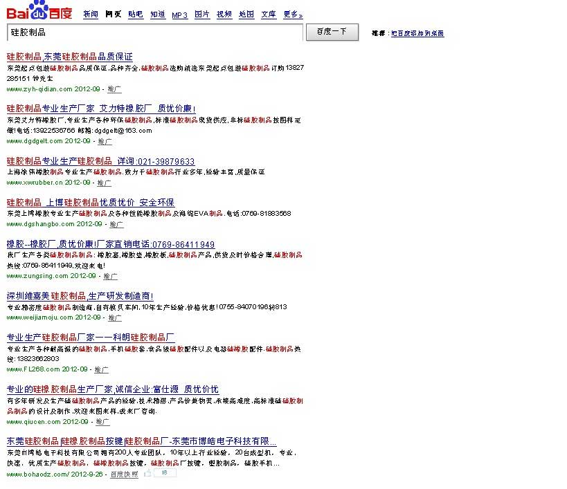 案例二、就是我們博皓電子優(yōu)化的關(guān)鍵詞“硅膠制品”相關(guān)的,進(jìn)入百度搜索框,搜索“硅膠制品”呈現(xiàn)出來(lái)的是9個(gè)推廣鏈接然后才是正常的鏈接,而且推廣鏈接并沒(méi)有和自然優(yōu)化鏈接有明顯區(qū)別,這叫我們seoer的情何以堪啊,雖然我硅膠制品之前是排名第一,但是還是排名第十了,一天一個(gè)ip可能都木有,都貢獻(xiàn)給了推廣鏈接,百度你能讓我們相信你嗎?