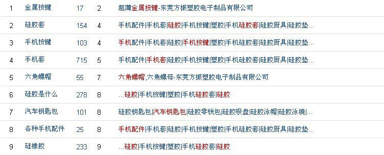 和我們博皓電子有交換友情鏈接,他們的網(wǎng)絡(luò)優(yōu)化情況比較熟悉,他們的網(wǎng)站很多硅膠方面的長尾關(guān)鍵詞可以通過百度搜索到,缺點(diǎn)是一些有百度指數(shù)的主關(guān)鍵詞有排名首頁的并不多,還需要加油中。