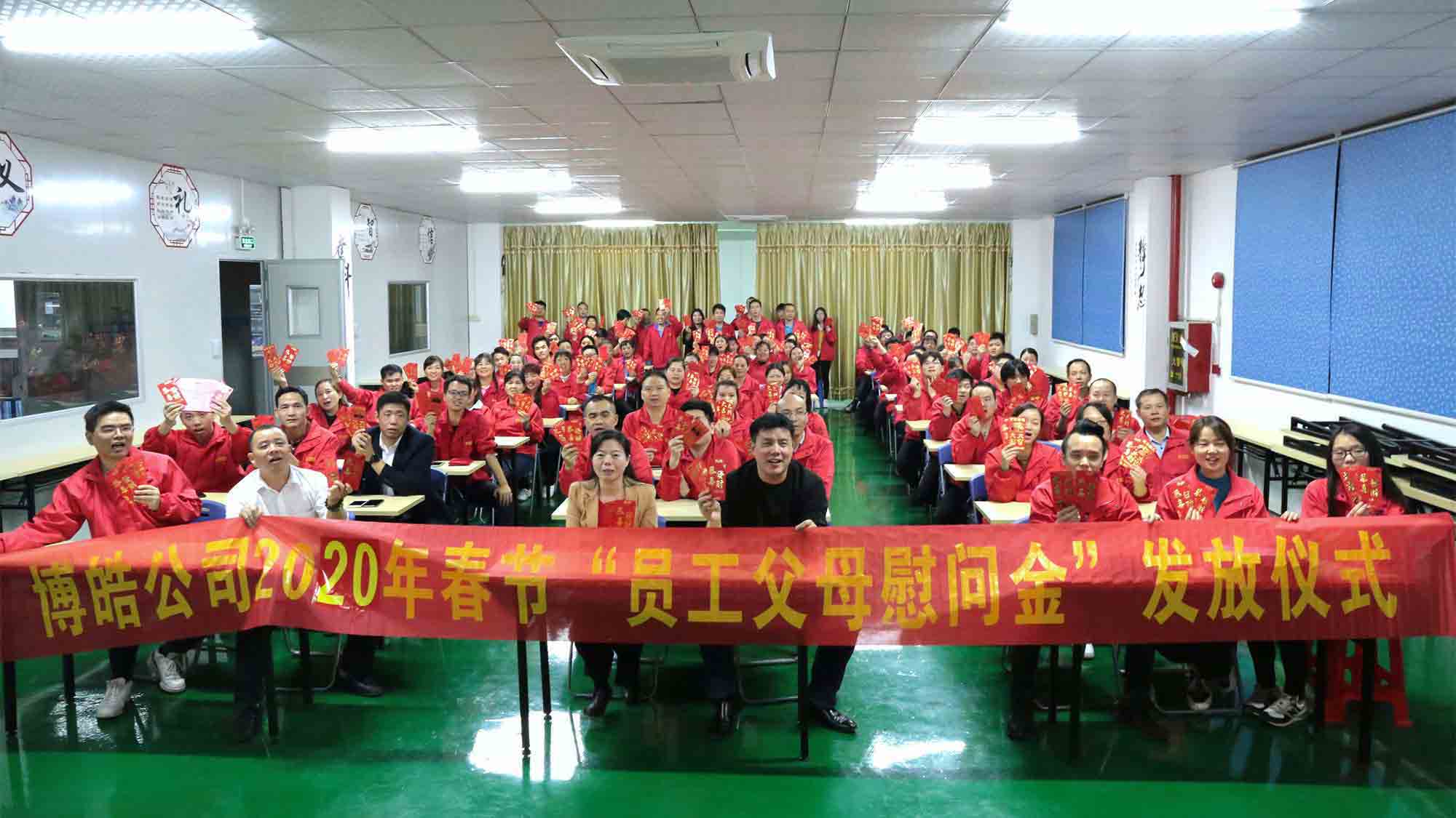 春節(jié)將至,博皓電子生產(chǎn)硅膠按鍵一線還是熱火朝天的加班中,2020年1月14日,雖然我們今年忙得年前沒有時間召開年會,但我們一年一度的博皓電子員工父母慰問金及差旅費發(fā)放儀式提前舉行。吳建議總經(jīng)理、盧柳林副總經(jīng)理、宗標(biāo)副總經(jīng)理、各分管經(jīng)理主管及全體員工共150余人參加本次活動。