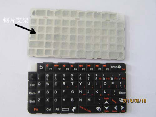 1.在塑膠和硅膠之間增加一層0.02mm后的鋼片,增加這種鋼片是取到整個鍵盤的按鍵帽的支撐作用。這個是我們工程師參照老的手機按鍵的設計結(jié)構(gòu)結(jié)合客戶需求研發(fā)出的一款大面積多鍵帽組裝的一款電子詞典鍵盤。
